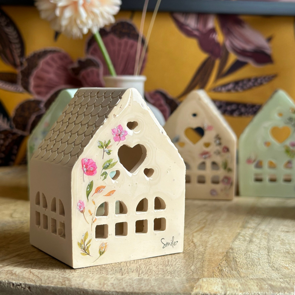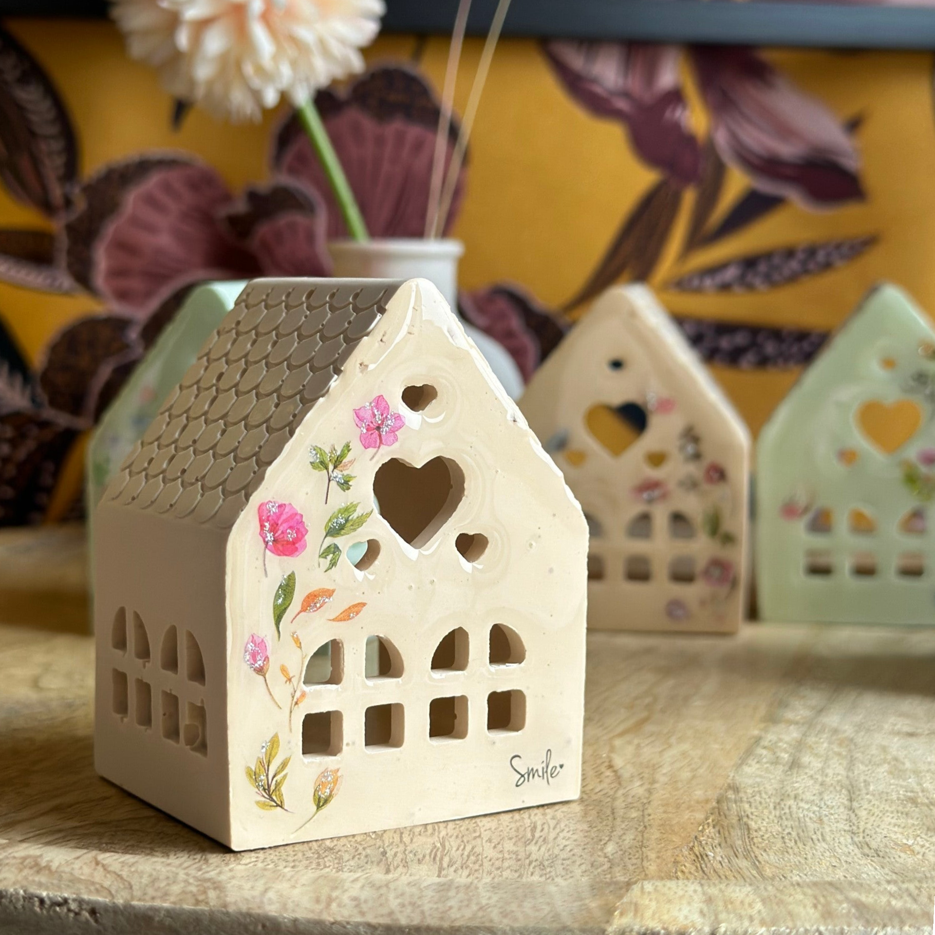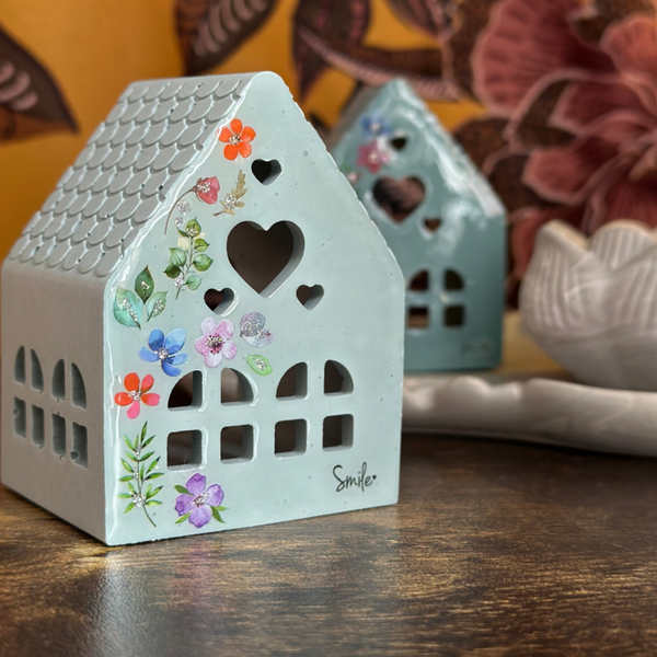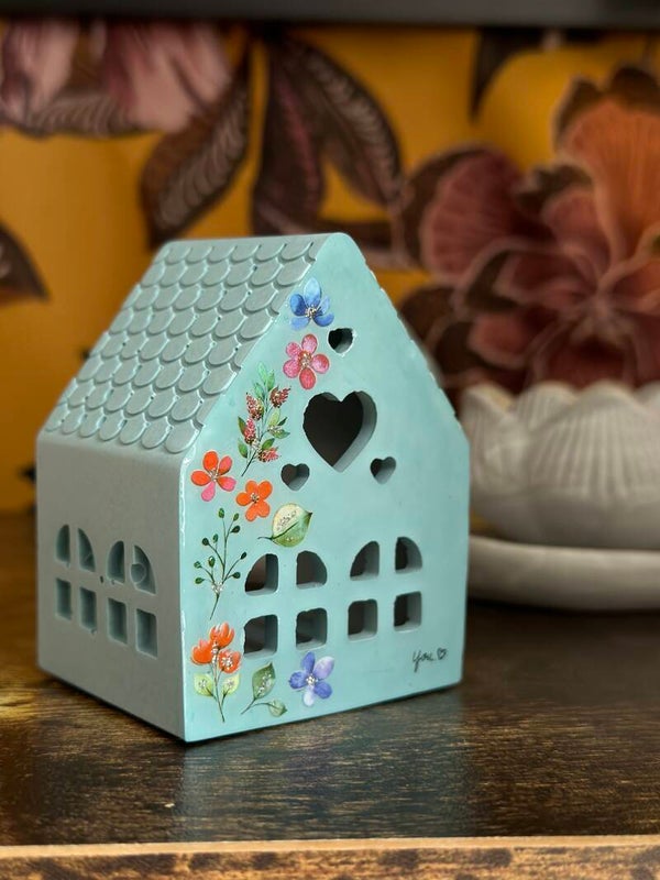 Graziosa casetta porta lumino in eco resina (Jesmonite) con decorazioni ricoperte da resina UV trasparente.