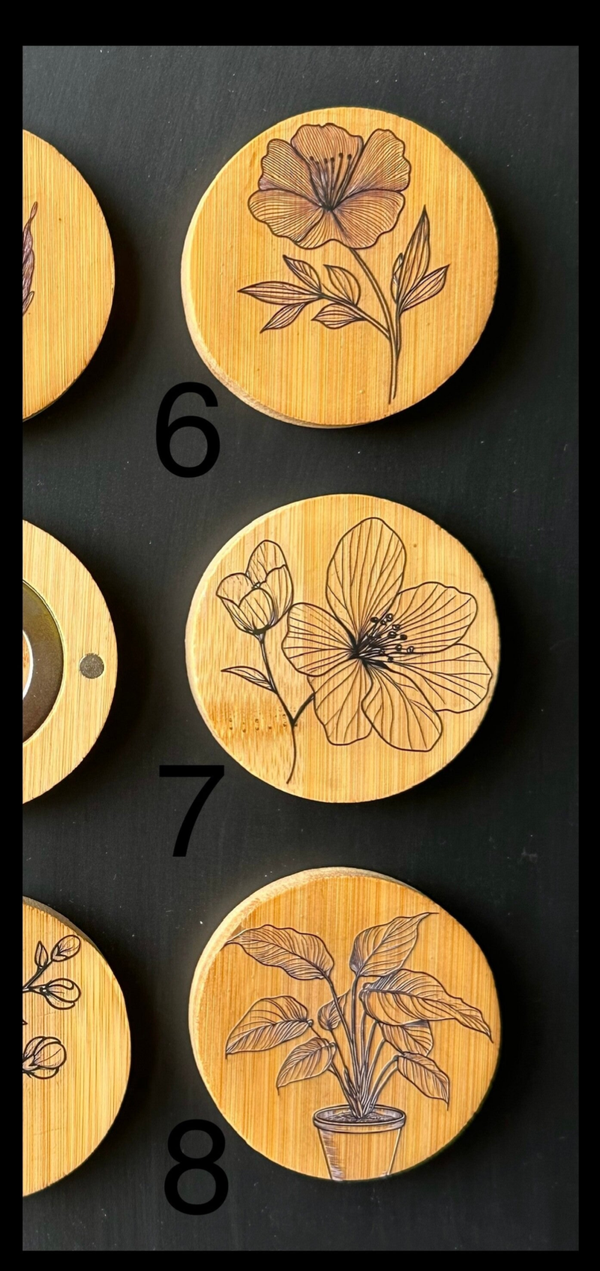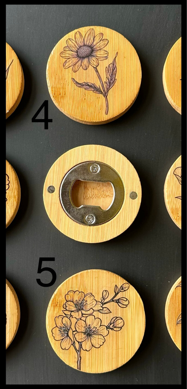 Calamita apri bottiglia in legno, con decorazione floreale e rifinitura in resina UV.